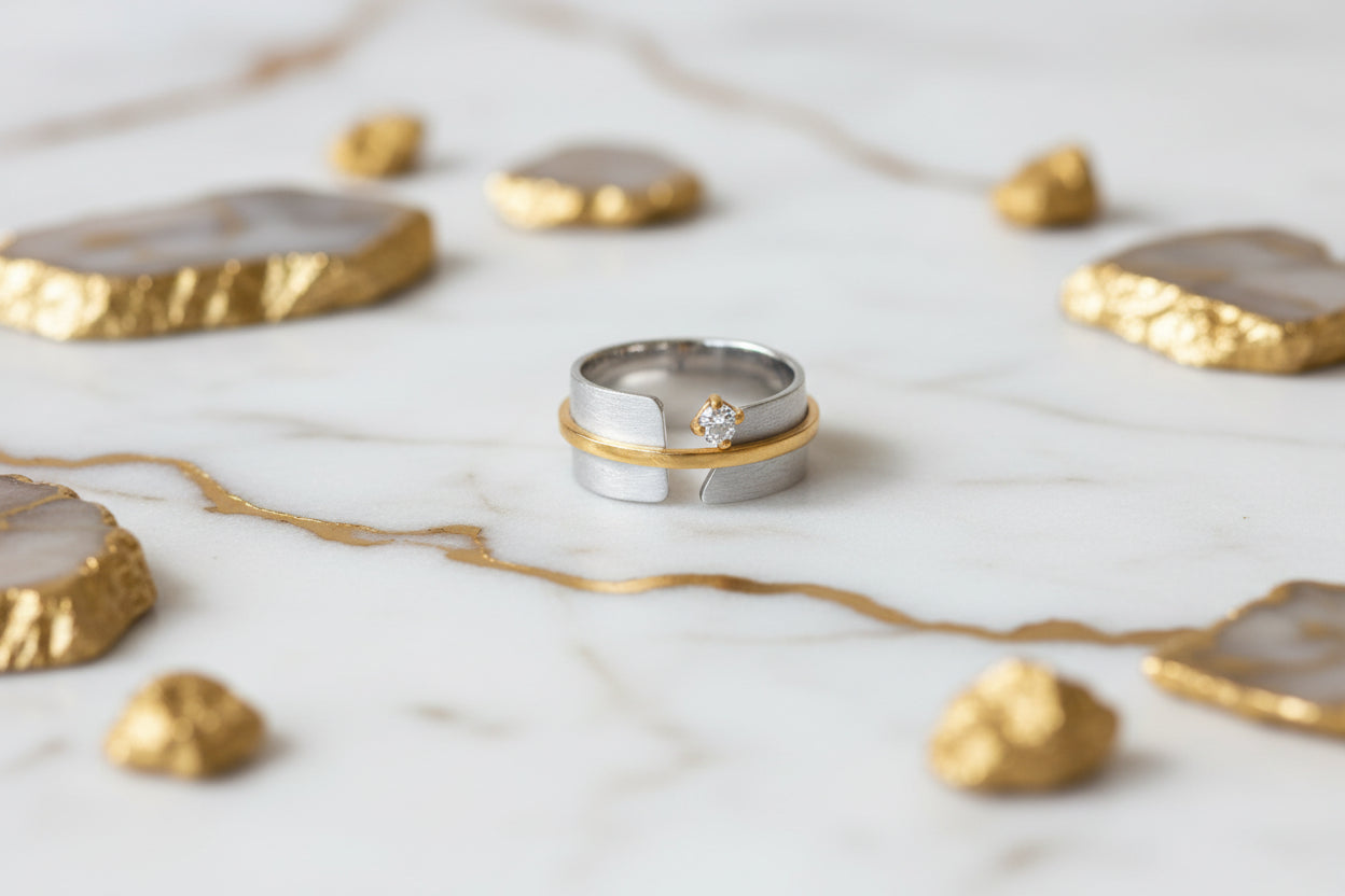 This modern art deco inspired ring is crafted from .925 sterling silver with a satin finish split band, centered by a hammered 14K gold plated accent. A 3mm cubic zirconia adds just enough sparkle without overpowering the architectural design. Striking on its own with mixed metals, this piece is made for everyday wear with elevated edge.