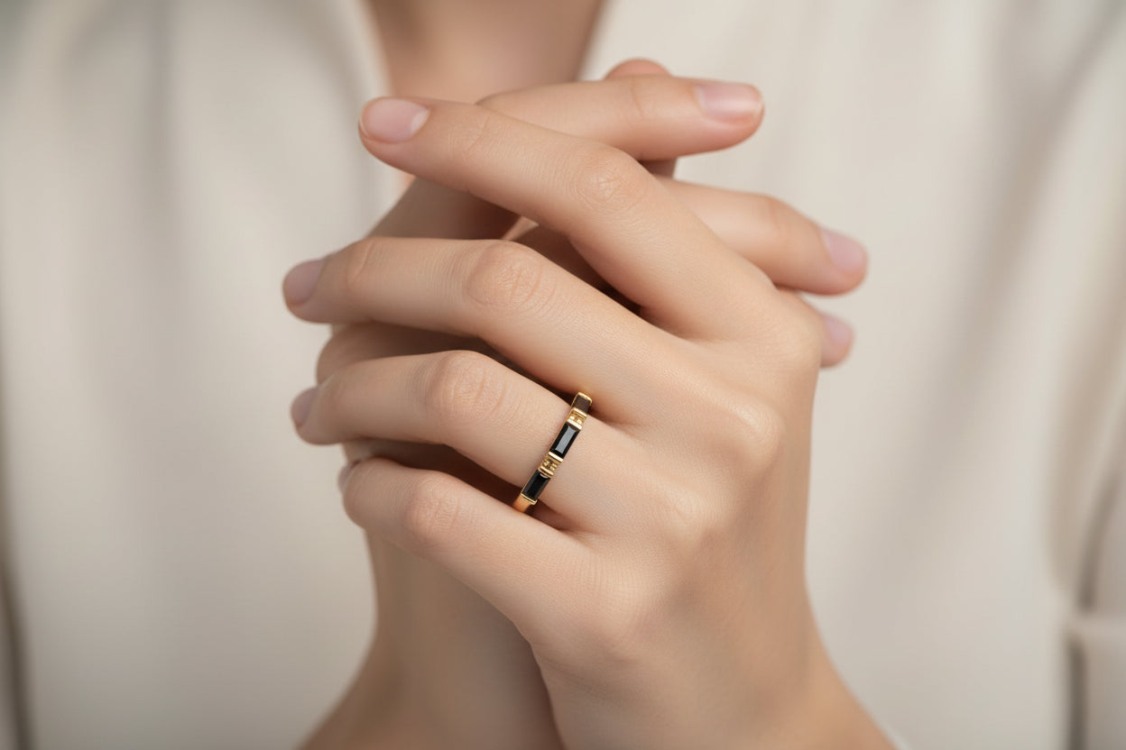 The Midnight Baguette Band features a row of black baguette-cut zirconia stones set into a polished gold-plated sterling silver band. The contrast is intentional with clean gold warmth against sharp black stones for a look that's modern, confident, and endlessly wearable. Designed with a slim profile, this ring is perfect worn alone or layered with your favorite bands for a more styled, stacked look.