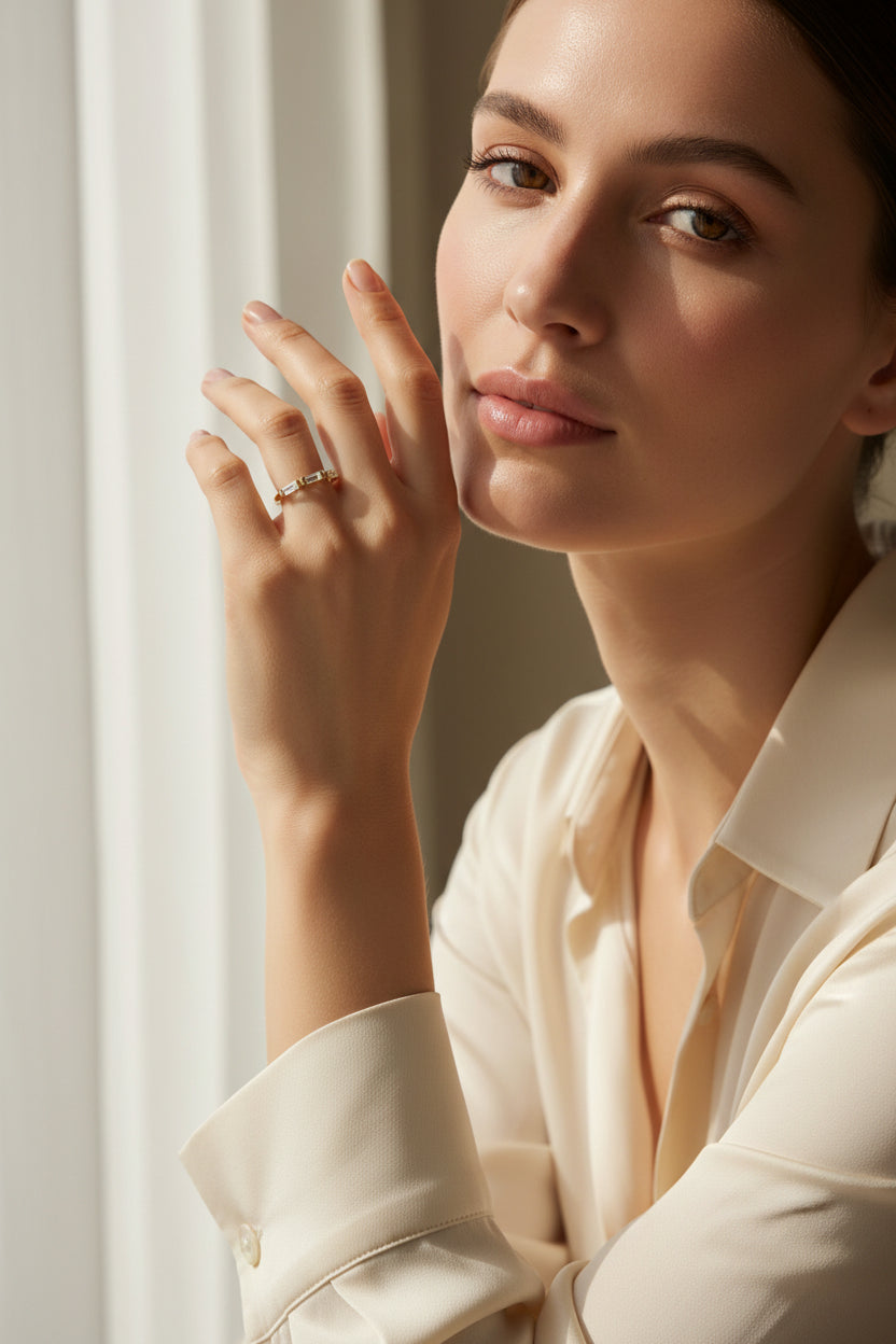 The Starlight Baguette Band features a row of clear baguette-cut zirconia stones set into a polished gold-plated sterling silver band. The contrast is intentional with clean gold warmth against clear stones for a look that's modern, confident, and endlessly wearable. Designed with a slim profile, this ring is perfect worn alone or layered with your favorite bands for a more styled, stacked look.